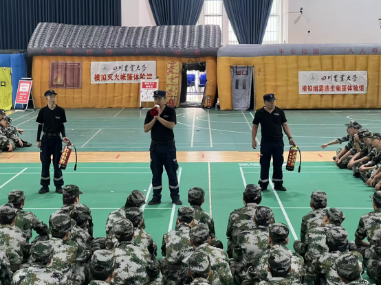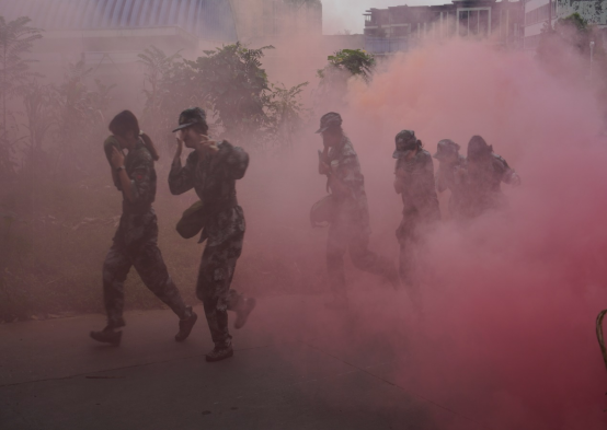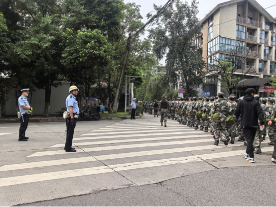更具突破性的是今年新增的实战科目——“应急演练”与“野外行军拉练”,在多方协同下取得显著成效。校区综管办统筹保卫、后勤等部门联合开展消防实训及应急逃生演练,全面锤炼学生应急处突能力。在组织野外拉练时,积极争取都江堰市公安局支持,地方派出十余名警力全程护航、维持秩序,构筑起一道坚实可靠的“移动安全屏障”,确保整个拉练任务安全圆满完成。
