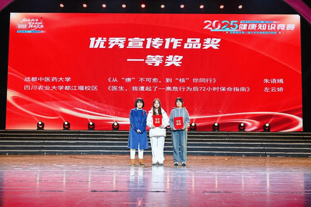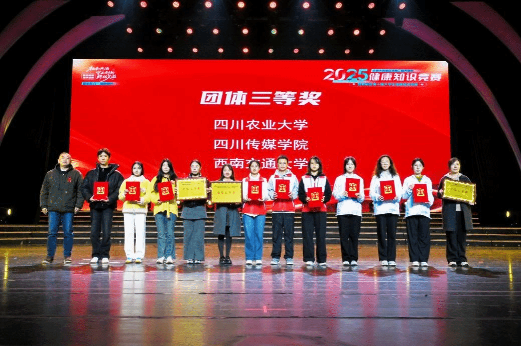 本次大赛由郫都区卫生健康局主办,温江区卫生健康局、崇州市卫生健康局、都江堰市卫生健康局协办,竞赛分为初赛和决赛,分别设置宣讲员个人赛与健康知识团体赛两类,吸引了西南交通大学、成都中医药大学、成都师范学院等高校的2000余名大学生代表积极参与。在团体决赛中,我校代表队以沉着冷静的良好表现,完成必答题、抢答题与风险题等环节的竞赛,最终荣获团体三等奖,充分展现出新时代大学生的精神面貌。