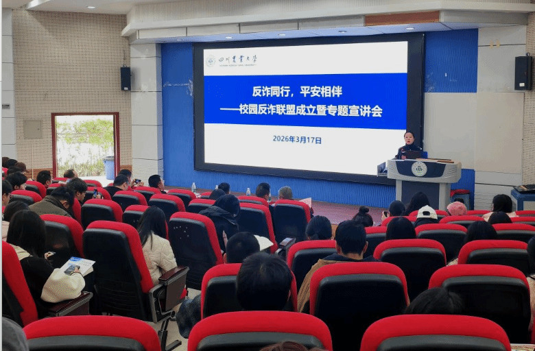 3月17日下午,都江堰校区综管办联合校区各单位成功举行“反诈同行,平安相伴”——校园反诈联盟成立暨专题宣讲会。校区综管办主任李维军、党委书记陈文华出席活动,都江堰市公安局南桥派出所所长廖苹、教导员韩永强等一行五人应邀来校作专题宣讲。活动由陈文华主持,各学院、职能部门、师生代表200余人参加。